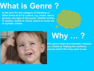 1) Genre refers to any category of literature, art, or other cultural works based on stylistic criteria. Film genres help audiences choose films and include categories like horror, thriller, science fiction, and fantasy.