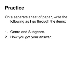 3. Genre: Folklore, Fable. Subgenre: How you got your answer: The passage retells the classic story of the fox and the cat with moral lessons