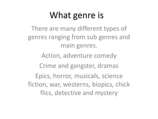 There are many genres of films including action, adventure, comedy, crime, drama, and science fiction. Genres are identified by conventions such as locations, props, characters, costumes, sound, cinematography, narrative, and themes. Over time, genres evolve in response to changes in society and audience tastes. For example, epic films now contain more action and focus on subgenres that audiences prefer such as biopics.