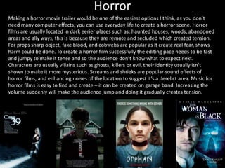 Horror films are relatively easy to make as they do not require many computer effects and can use everyday locations like haunted houses, woods, and alleys to create tension. Common props include sharp objects, fake blood, and cobwebs. Successful horror films have a fast, jumpy editing pace to keep the audience unsure of what will happen next. Villains like ghosts or killers are usually not clearly shown to maintain mystery. Screams and location sounds build an eerie atmosphere.