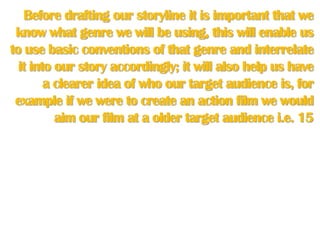 The document discusses choosing a genre for a storyline. It explains that knowing the genre enables the use of basic conventions and helps relate the story accordingly. The genre also helps identify the target audience. The document analyzes the genres of drama and thriller, noting their conventions like realistic settings, characters and situations for drama and emphasized danger for thrillers. It determines drama was the best choice given available resources to create realistic settings and a storyline people could relate to.