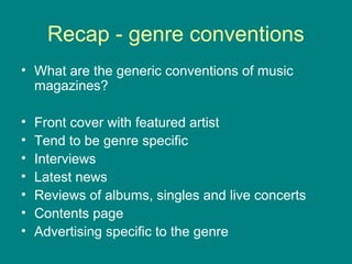 This document discusses genre targeting in music magazines. It begins by defining the typical conventions of music magazines, such as featuring artists on the cover and being genre-specific. It then explains that the music industry categorizes music into genres in order to target specific markets. Different genres appeal to different demographic and psychographic groups. Effective genre research is crucial for a new music magazine to identify the appropriate genre to cover and understand that genre's history, key artists, audience, subgenres, public perception, competitors, and future trends. The document provides a task for students to conduct extensive genre research and present it in a PowerPoint covering 10 specified areas of analysis.