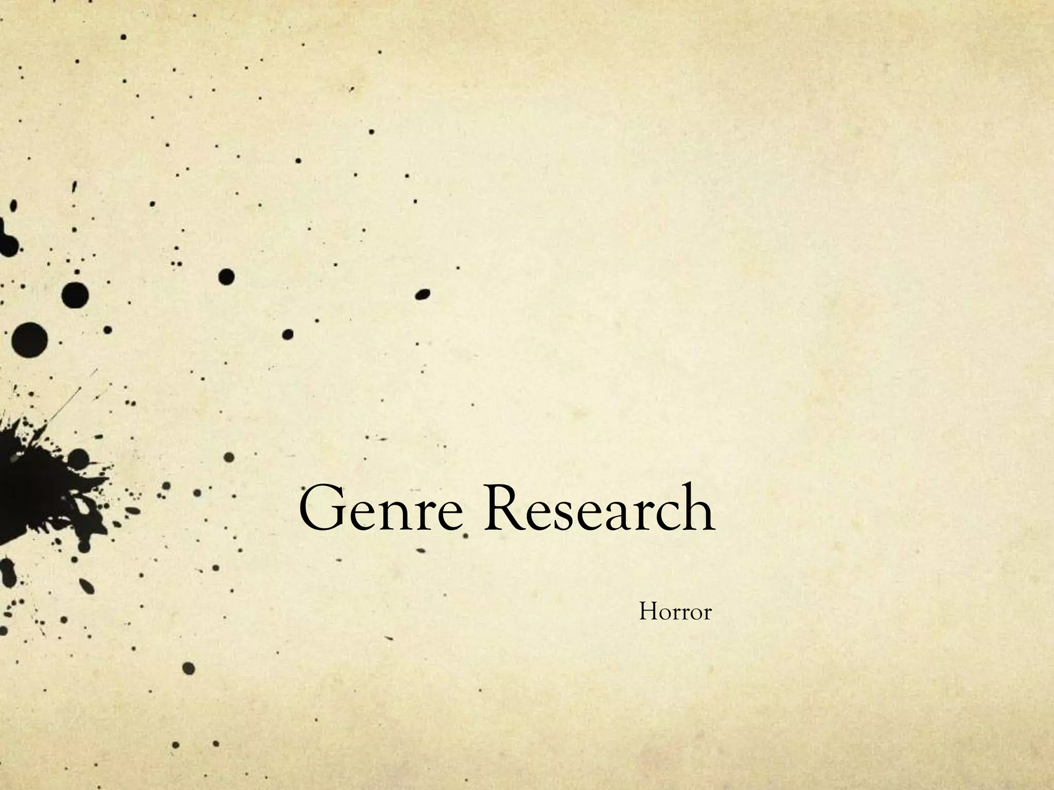 Horror films use certain themes, props, settings, and character archetypes to invoke fear and thrill audiences. Common themes include hauntings, religion, good vs. evil, and monsters. Props like knives and masks are often used to denote the genre. Settings tend to be graveyards, abandoned buildings, cabins, and haunted houses at night to create tension. Character archetypes include the final girl protagonist, the unlikely hero, the antagonist villain, and the sex appeal character who is often the first to die.