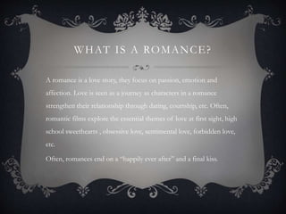A romance focuses on the development of a love story and relationship between characters. It often explores themes of love at first sight and ends with the characters united in a happy relationship. The earliest known romantic film was from 1896 and lasted only 18 seconds. Romantic genres include romantic dramas, romantic comedies, and historical romances. The filmmakers chose to make a romance because they felt the director could relate well to the genre and draw from real life experiences and inspiration from films like "Sliding Doors" and "About Time". Conventions of romances include affection, passion, arguments, climax, and the development of emotions between the characters.