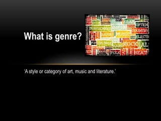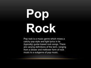 This document discusses pop rock music genre and analyzes the covers of four magazines. Pop rock mixes catchy pop style with light lyrics in typically guitar-based rock songs. The magazine covers analyzed have varying designs with different uses of color, fonts, photos, and article descriptions to appeal to different audiences. They incorporate styles associated with pop, rock, and gothic genres through visual elements like dark makeup, tattoos, and varied color schemes.