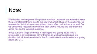 The document discusses changing the plot of a short film to incorporate elements of psychological horror and teen drama genres. It was decided to focus on teenagers and young adults as the target audience. Research was conducted on popular teen drama movies like Juno and Thirteen that deal with themes of teen pregnancy, drug use, and family issues. These films provided inspiration for creating a more realistic story centered around a teenager dealing with dissociative identity disorder.