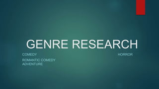 The document discusses four genres of film - comedy, horror, romantic comedy, and adventure. It notes that comedy aims to make audiences laugh through humor and exaggerated characters, while horror seeks to elicit negative emotions by playing on primal fears. Romantic comedies have lighthearted plots centered around love and relationships, and adventure films are set in exotic locations and explore concepts of survival, animals, roads, and heroes/heroines.