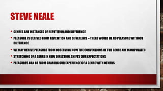 This document discusses genres and how audiences engage with them. It notes that genres provide both repetition through conventions but also novelty through variations, and this combination provides pleasure for audiences. Genres establish expectations for audiences and filmmakers can manipulate expectations for effect. Pleasure comes from both recognition of genre conventions and surprise at an artist stretching those conventions. The document also examines how genres are used by filmmakers, marketers, and audiences to understand a film's format, target demographic, and how to anticipate its structure.