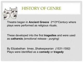 The document discusses the history and purpose of genre in media. It explains that genres originated from Ancient Greek plays that were used for religious rituals and emotional release. Over time, genres such as comedy and tragedy became standardized ways to categorize plays. The document also discusses how genres help audiences understand what to expect from different media works and allow them to be more easily marketed and sold. However, genres have become more hybridized and fluid over time as they incorporate elements from multiple genres.