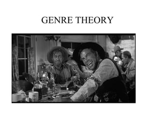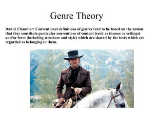 Genre theory posits that genres are defined by certain conventions of content, themes, settings, and forms that are shared among texts belonging to that genre. However, genres are dynamic and open to negotiation rather than fixed forms. Individual texts can also belong to multiple genres depending on factors like location and time period. Genres provide frameworks that position readers and viewers in certain ways, but also offer pleasures through repetition of conventions alongside innovation and deviation from expectations.