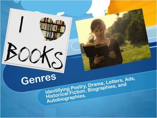 Poems have a certain form like stanzas or lines and use rhythm, rhyme, and figurative language. Dramas tell stories through action and dialogue. Letters have a heading, greeting, body, closing, and signature. Ads must be persuasive to change beliefs and often use imagery. Historical fiction blends facts with fiction to study history through stories. Biographies are about a person written by an author. Autobiographies are written by the person about their own life.