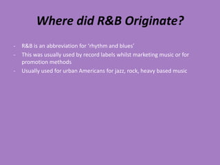 This document discusses the origins and evolution of the R&B music genre. It originated in the late 1950s from genres like jazz, rock, and blues. Over time, R&B incorporated elements from other genres like funk, soul, and gospel. Today, R&B music often portrays themes of wealth, struggle and success, sexuality, and substance use. Popular R&B artists are frequently presented as sex symbols and role models who sing about their emotions and experiences. Music videos in the genre commonly feature lavish displays of money, possessions, and women dressed in a sexually explicit manner.