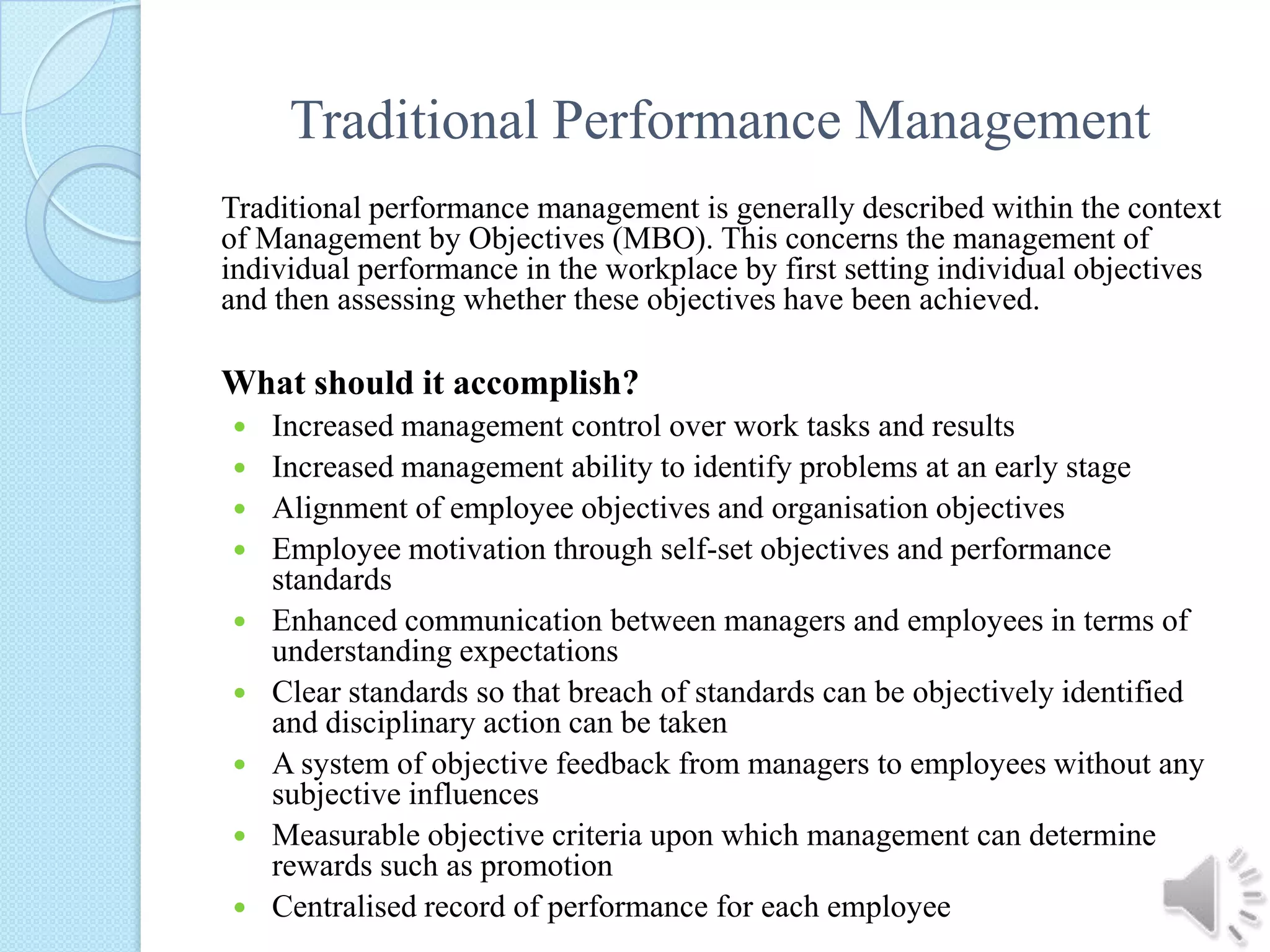 Traditional performance management focuses on setting individual objectives and assessing achievement. While intended to increase control, identify problems early, align goals, motivate employees, and provide clear standards, in reality managers are reluctant to give honest feedback and employees do not believe managers are qualified to evaluate them. Only 30% of workers feel performance management helps improve performance. Automated performance management aims to implement best practices more easily and improve feedback quality. A study of Pakistani industries found positive relationships between effective management by objectives practices, organizational productivity, and employee performance. The balanced scorecard measures performance across financial, customer, internal process, and learning/growth perspectives. 360 degree feedback involves confidential, anonymous feedback from subordinates, peers, and supervisors to provide development insights.