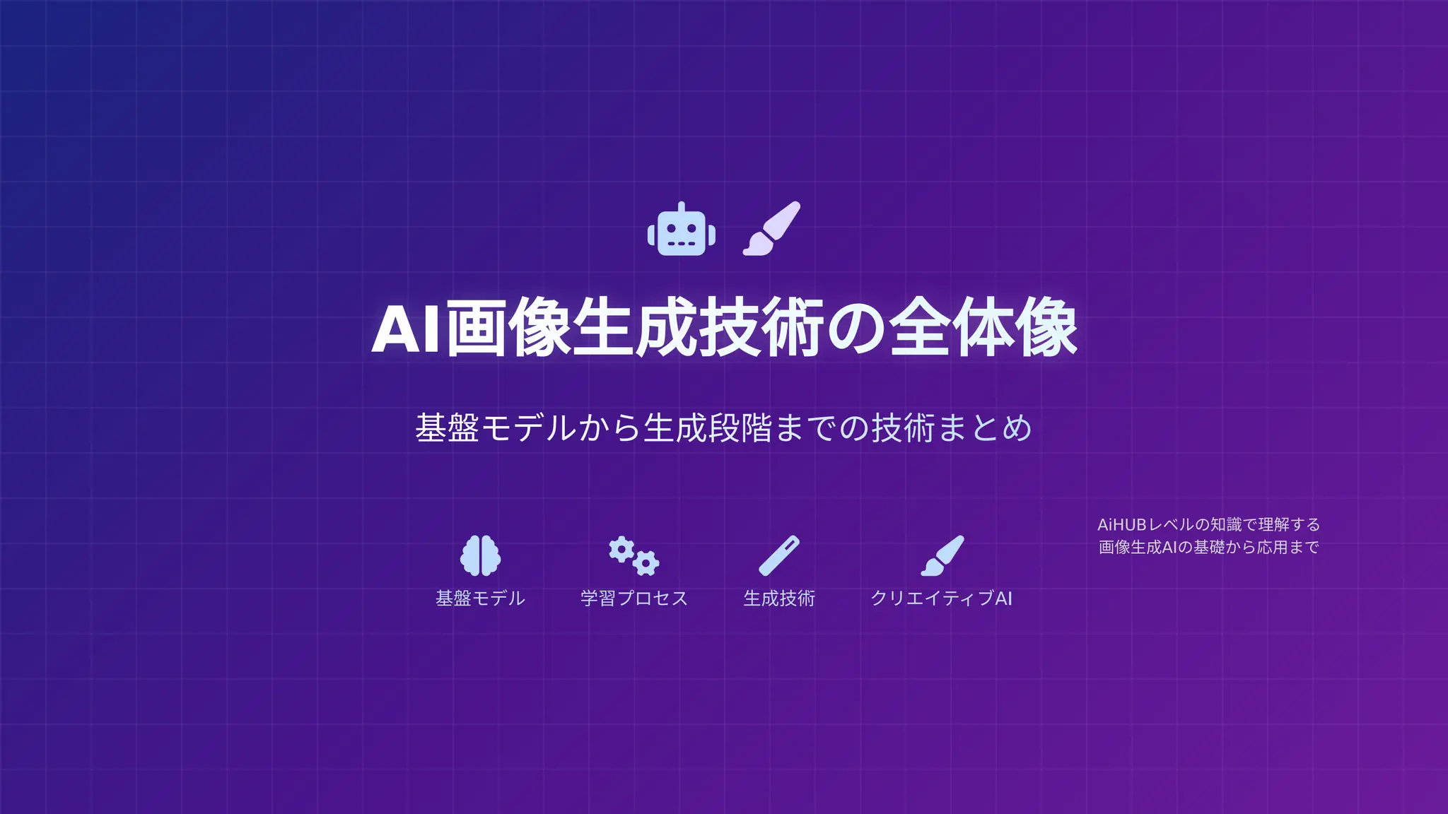 AI画像生成技術の全体像 AI画像生成技術の全体像 基盤モデルから生成段階までの技術まとめ 基盤モデル 学習プロセス 生成技術 クリエイティブAI AiHUBレベルの知識で理解する 画像生成AIの基礎から応用まで
