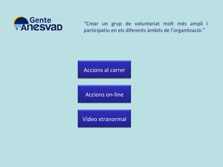 Gente “ Crearun grup de voluntariat molt més ampli i participatiu en els diferents àmbits de l’organització.” Accions al carrer Accions on-line Vídeo xtranormal