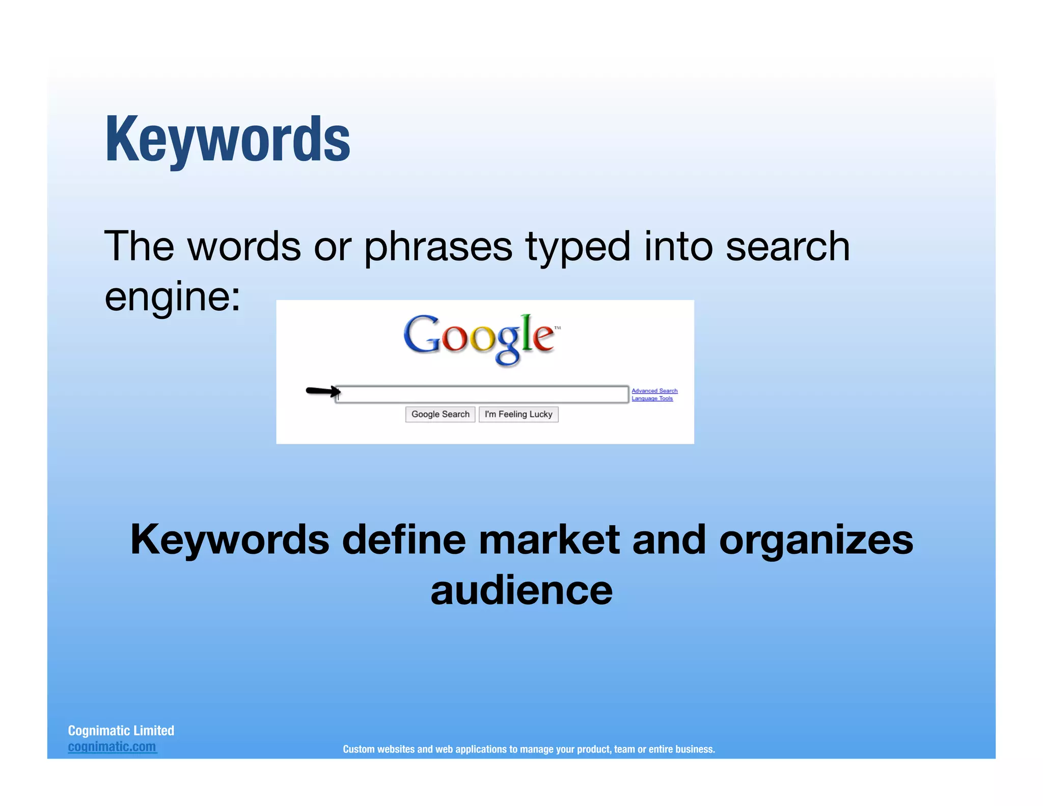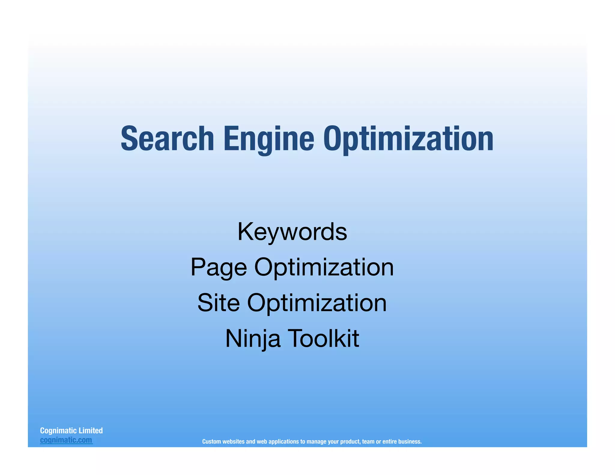 Cognimatic Limited specializes in custom websites and web applications designed to help manage various business aspects. The document outlines the importance of keyword research, page and site optimization, including strategies for effective content creation and technical aspects like HTML5 and meta tags. Additionally, it lists tools for enhancing SEO performance and analytics.
