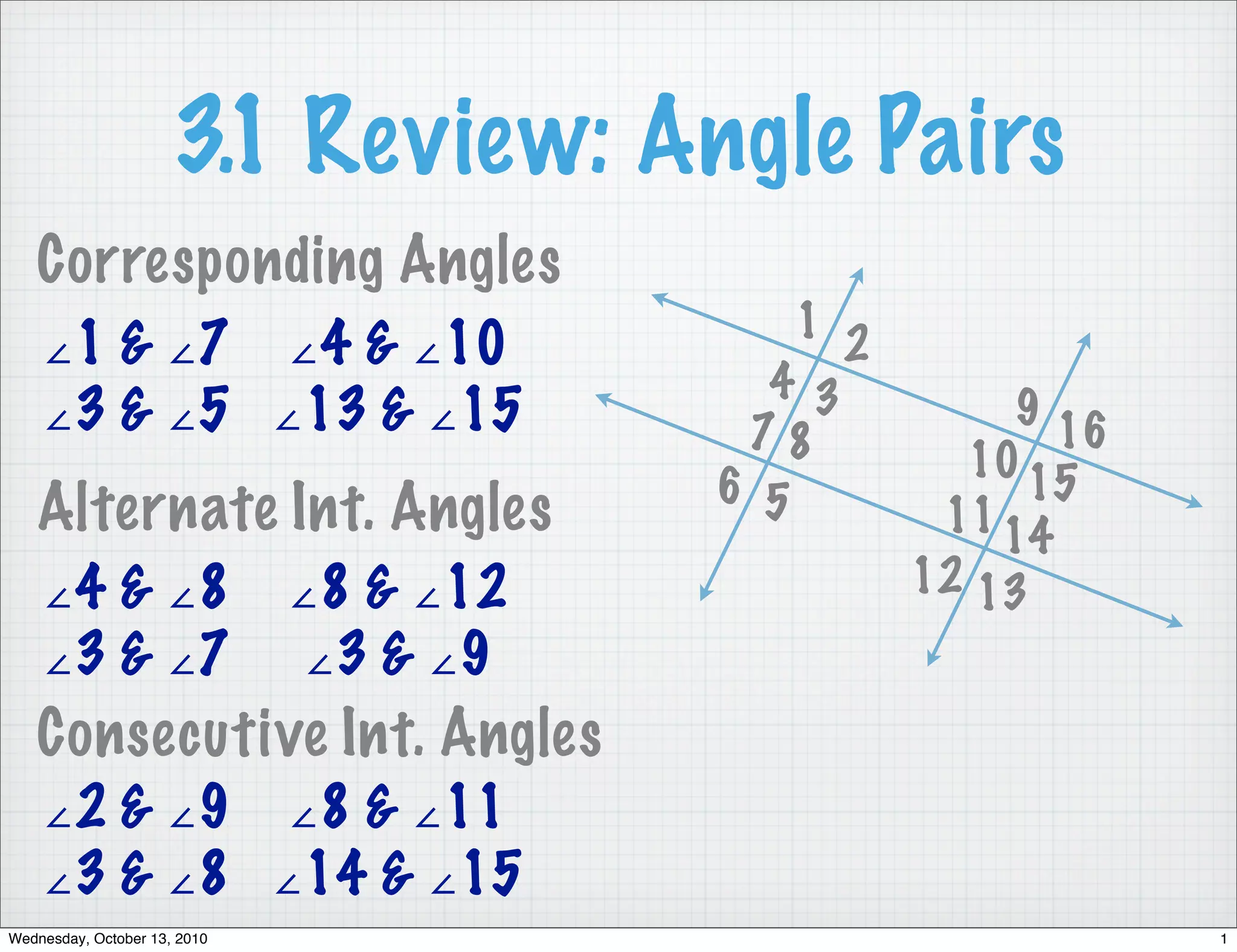 This document reviews different angle pairs that are formed when two lines intersect or are parallel, including corresponding angles, alternate interior angles, consecutive interior angles, alternate exterior angles, and vertical angles. It provides examples of using these angle relationships to determine if lines are parallel or to find the measure of unknown angles. The last pages discuss writing the converses of the angle theorems and using congruent or supplementary angles to prove that two lines are parallel. Students are assigned problems applying these concepts for homework.