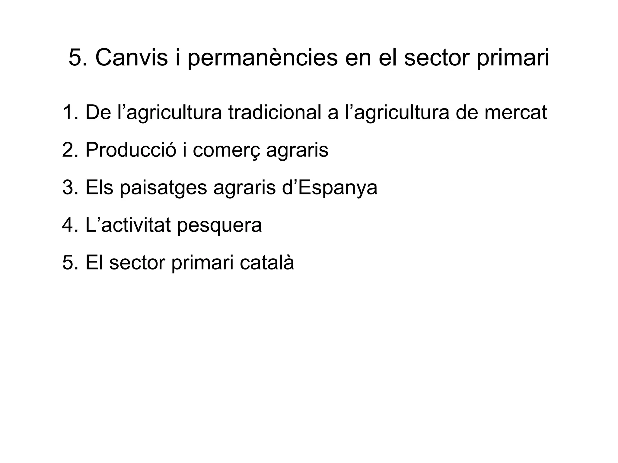 5. Canvis ipermanències en el sector primari De l’agricultura tradicional a l’agricultura de mercat Producció i comerç agraris Els paisatges agraris d’Espanya L’activitat pesquera El sector primari català