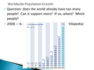 2. It notes that over 90% of the world's population lives in the Northern Hemisphere, with high densities in coastal and river regions. More than half of the world's population lives in rural areas but urbanization is increasing.