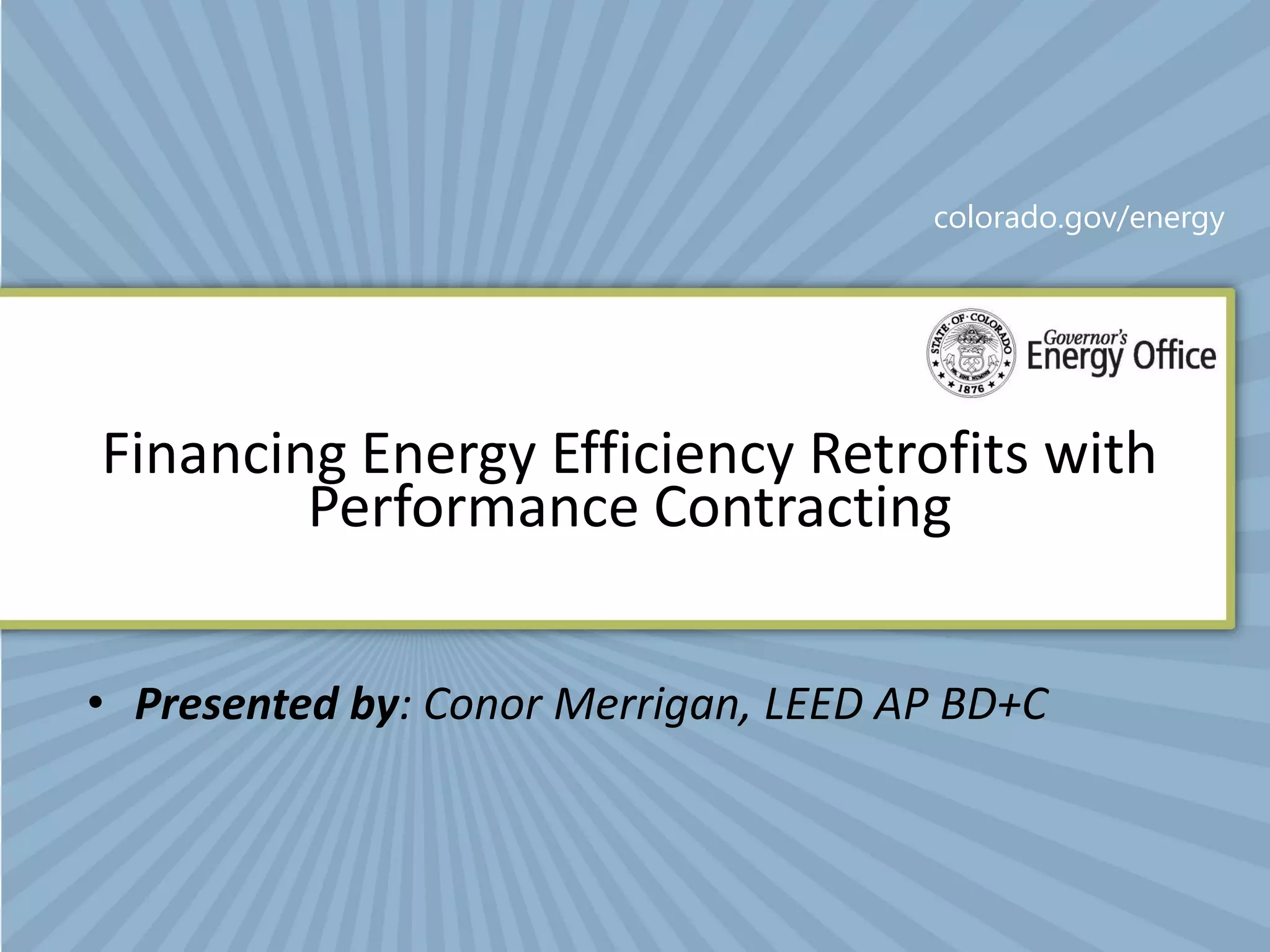 The document discusses energy performance contracting (EPC) as a way for organizations to finance energy efficiency upgrades without using capital budgets. It provides an overview of the Governor's Energy Office (GEO) EPC program in Colorado, including the typical EPC process, case studies of EPC projects in Colorado schools and state agencies, and opportunities and challenges for expanding EPC in both the public and private sectors. The GEO pre-qualifies energy service companies and provides support to help public entities navigate the EPC process to implement upgrades paid through guaranteed energy savings.