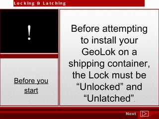 The document provides instructions for installing a GeoLok locking device on a shipping container. It explains that the lock must be in an "unlocked" and "unlatched" condition before installation. It describes how to verify the lock is unlatched by squeezing the latch release against the carry handle to open the latch. It also describes how to check if the lock is unlocked by pushing in the square drive socket, and if it does not push in then a valid unlock code is needed to proceed.
