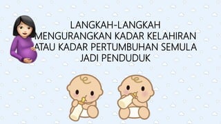 Dokumen tersebut membahas program kawalan penduduk dan langkah-langkah untuk mengatasi masalah akibat kadar pertumbuhan penduduk yang pesat di Malaysia. Langkah-langkah tersebut termasuk program perancangan keluarga, dasar saiz keluarga kecil, menaikkan had umur boleh kahwin, program kebajikan keluarga, memperluas pembangunan ekonomi, dan meningkatkan kualiti sumber manusia.