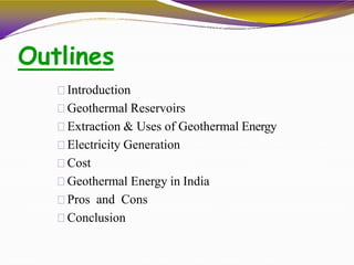 Geothermal energy is a renewable energy source that harnesses heat from within the earth. It can be extracted from geothermal reservoirs found in areas with geysers, hot springs, volcanoes, and boiling mud pots, where hot water and steam are trapped in porous rock. This heat energy can be used directly, such as for heating buildings and greenhouses, or indirectly for electricity generation in dry steam, flash steam, or binary cycle power plants. While geothermal energy has advantages of being continuously available and having little environmental impact, development is limited by high upfront costs and the risk of reservoirs running dry or releasing harmful gases.