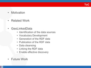 GeolinkedData is an initiative aimed at enriching the web with Spanish geospatial data, starting with information from sources like the National Geographic Institute of Spain. The project involves data source identification, vocabulary development, RDF data generation, and data cleansing, ultimately facilitating effective data discovery. Future work includes expanding datasets to cover additional domains, incorporating complex geometrical data, and enhancing connections with other linked data sources.