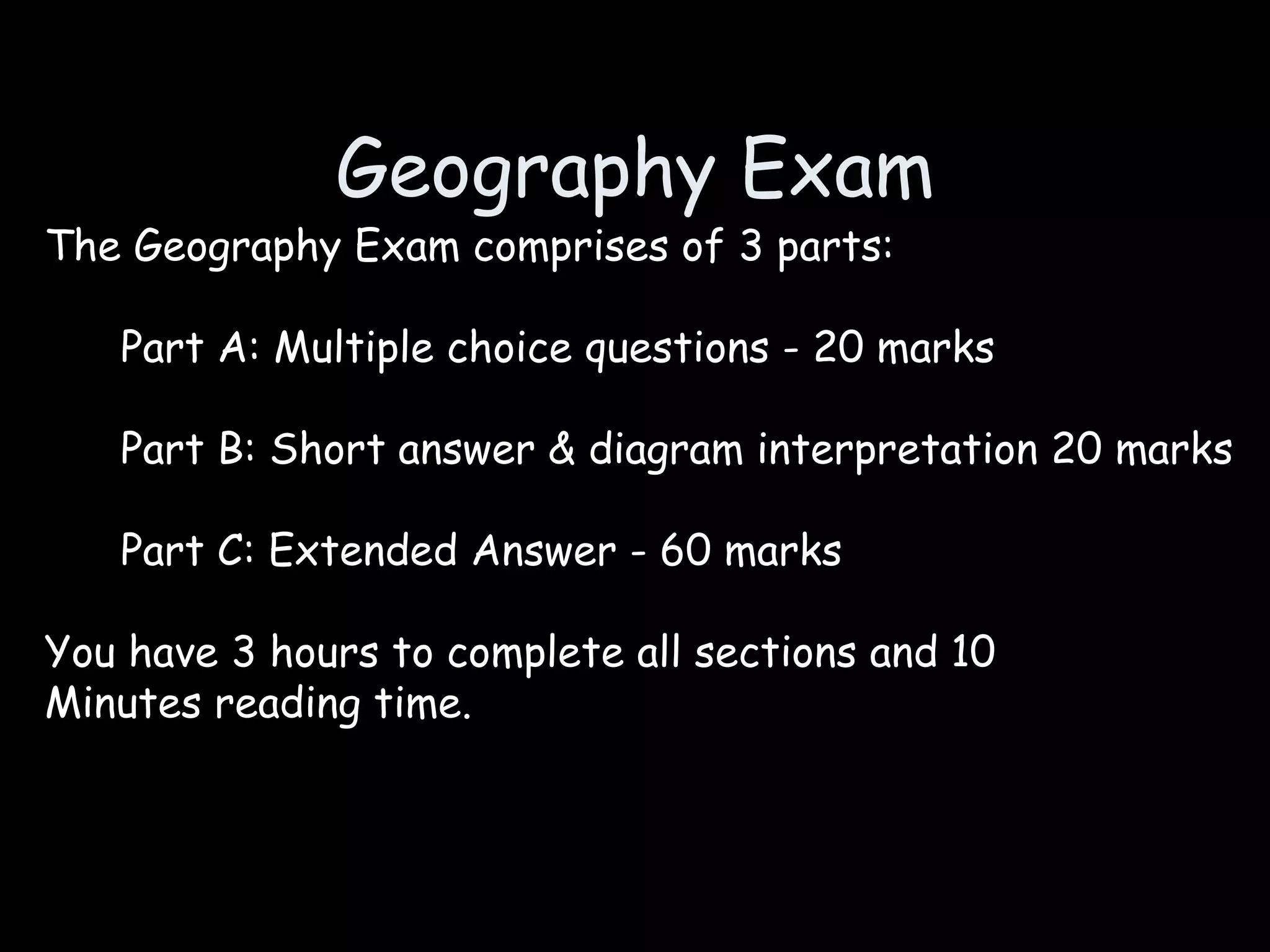 - The exam has 3 parts: multiple choice, short answer, and extended answer