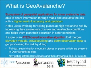 GeoAvalanche is an integrated avalanche risk management system that uses geospatial applications and data sharing to calculate snow avalanche risk with high accuracy. It uses elevation models, crowdsourced data, and earth observation data in an algorithm to assess risk. GeoAvalanche helps users avoid high risk areas and plan safer excursions by increasing awareness of snow and avalanche conditions. The system includes web services for accessing avalanche data, risk calculations, and crowdsourced incident reporting.