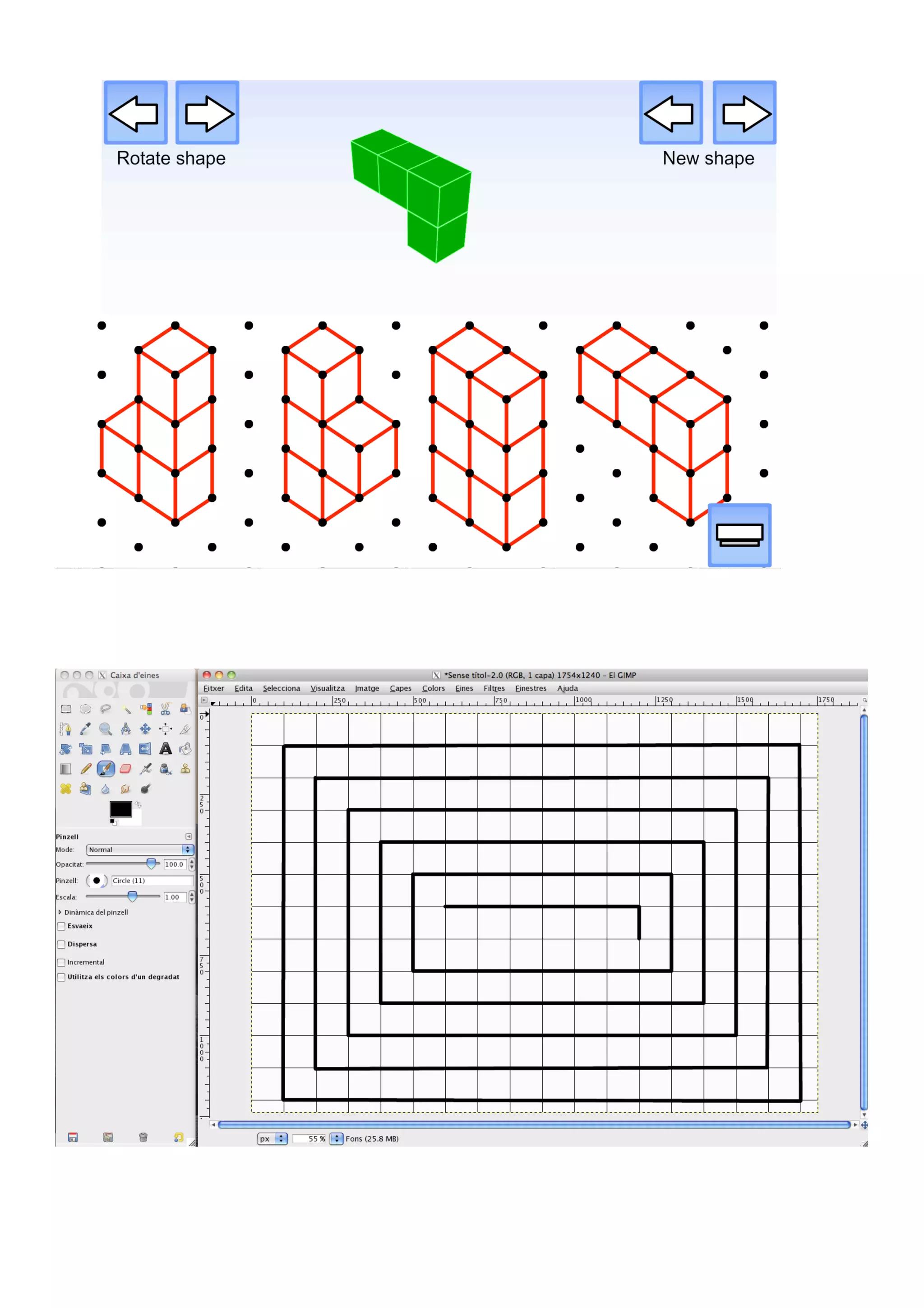 This document outlines a geometric design workshop that uses geoboards and the software GIMP to explore geometry. The workshop consists of 4 sessions: 1) Drawing shapes on paper and online geoboards, 2) Drawing 3D shapes on an isometric geoboard, 3) Using GIMP grids and templates to draw plane and solid figures, and 4) Inventing and coloring original geometric designs.