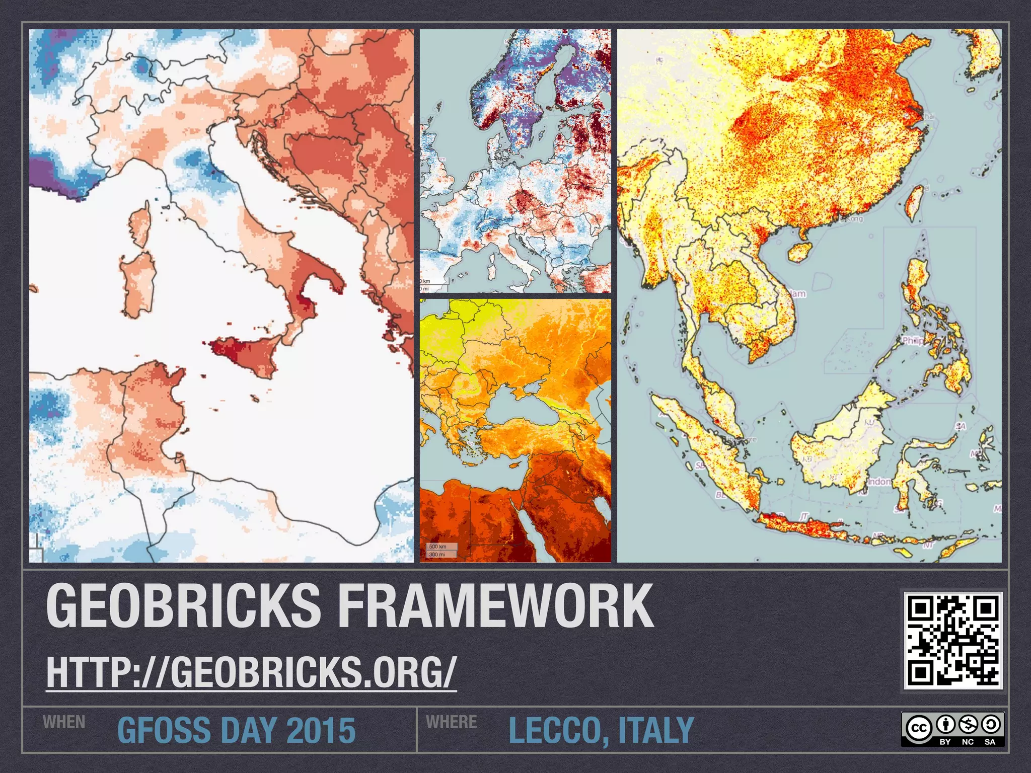 The document discusses the Geobricks framework, an open source modular architecture for building geospatial web services and applications. It consists of libraries, REST services, and backend modules. The architecture uses a 3-tier service oriented design. Example modules allow downloading data from various sources, processing it using OGR and GDAL, and distributing outputs through OGC standards and other methods. A 2008 Afghanistan drought case study demonstrates acquiring MODIS and TRMM data, processing it to show anomalies in temperature, rainfall, NDVI and other outputs to analyze the drought's impacts.