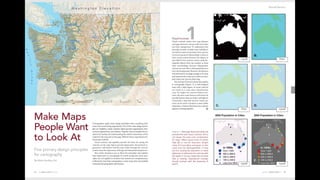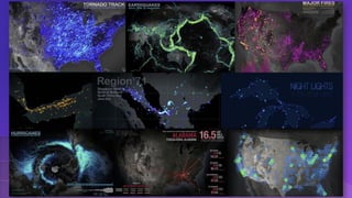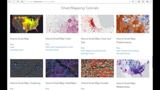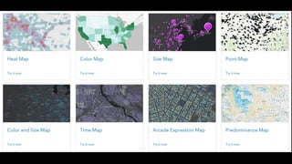 This document provides an overview of mapping and visualization techniques using ArcGIS. It discusses mapping concepts like reference mapping, thematic mapping, page layouts, 3D mapping, web maps and apps, story maps, and smart mapping. It also introduces the ArcGIS Living Atlas and Firefly cartography. Exercises are included to allow users to practice different mapping skills within ArcGIS like symbolizing layers, labeling maps, making page layouts, converting maps to scenes, and creating web apps.