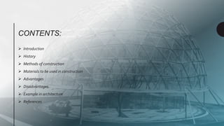 The document provides a comprehensive overview of geodesic domes, covering their structure, history, construction methods, materials used, advantages, disadvantages, and architectural examples. It highlights the development of geodesic domes from early designs by Walter Bauersfeld and R. Buckminster Fuller, emphasizing their strength, efficiency, and quick assembly. Additionally, the document discusses various applications and the challenges faced in their construction.