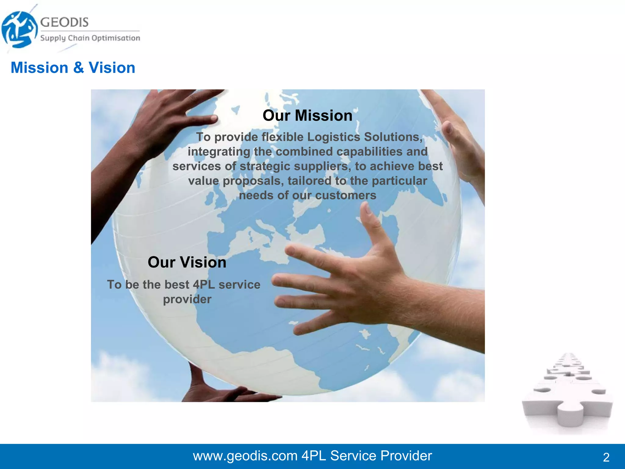 The document describes Geodis' services as a 4PL provider in South America. It outlines Geodis' mission to be the best 4PL provider and provide flexible logistics solutions. It then lists Geodis' service portfolio including transportation, warehousing, customs services, and supply chain management. It provides details on Geodis' end-to-end logistics services and benefits, as well as its regional coverage across major South American countries.