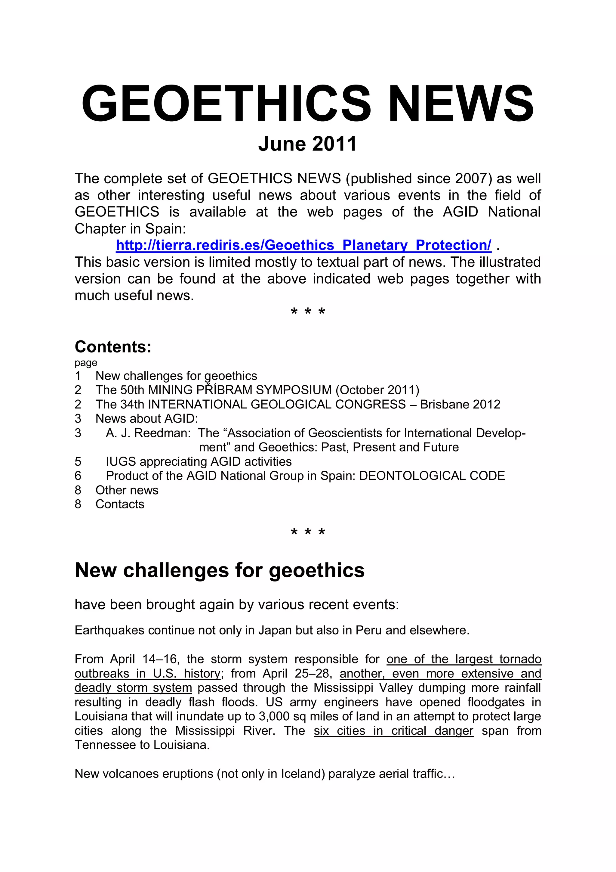3) A history of the Association of Geoscientists for International Development (AGID) and its role in promoting responsible resource management and early concepts related to geoethics.
