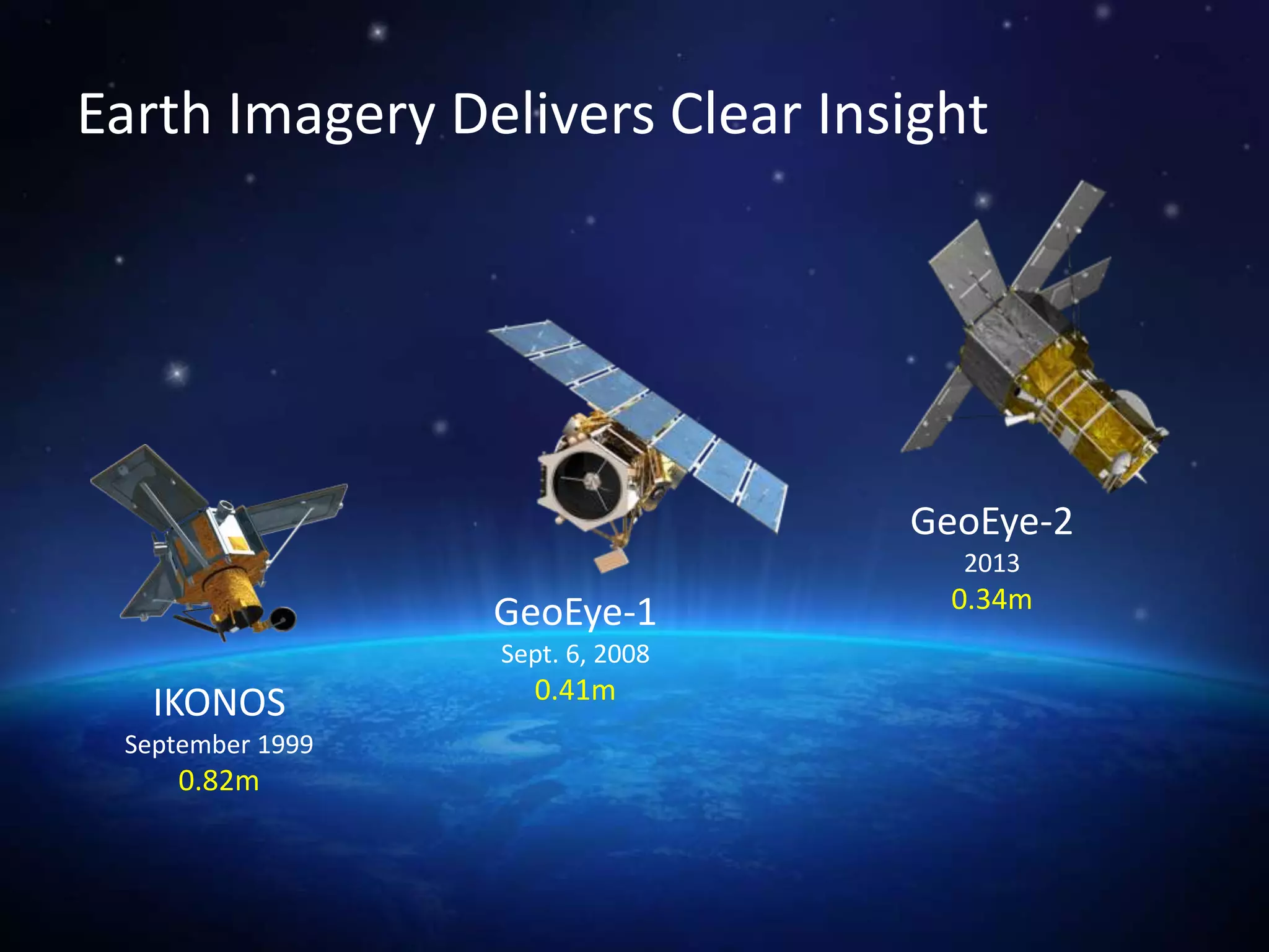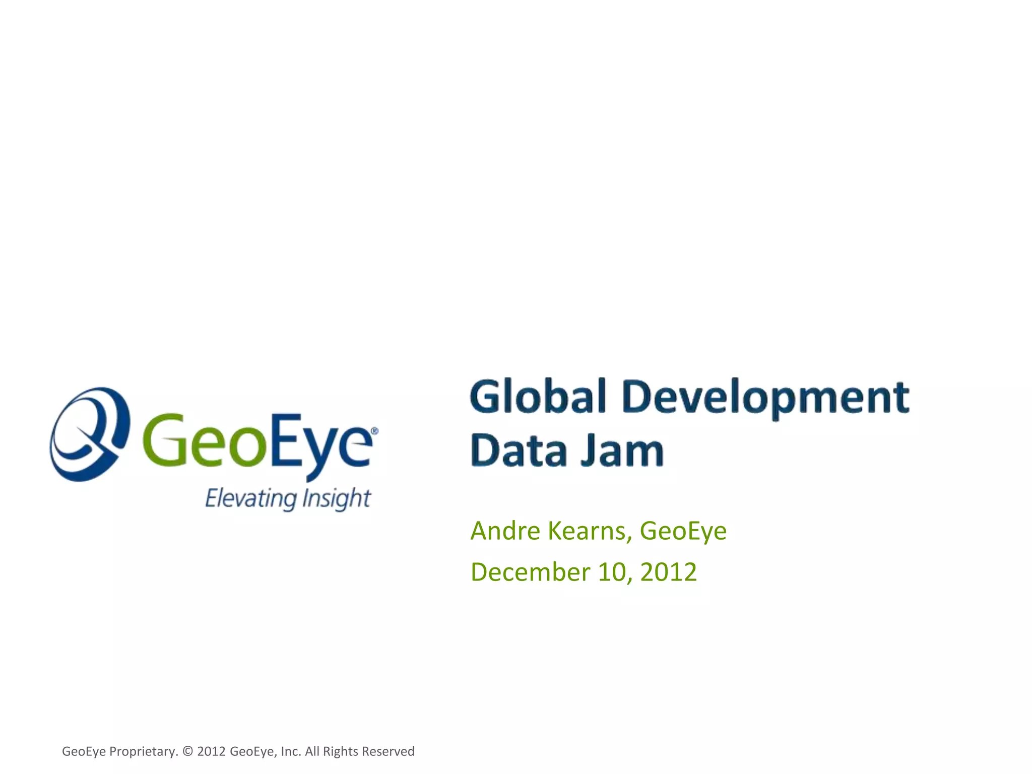 The document discusses GeoEye's satellite imagery capabilities, highlighting different satellite images and their resolutions, including GeoEye-2 and Ikonos. It emphasizes the role of geospatial analytics in providing insights for critical decision-making. The content reflects GeoEye's proprietary technology and its impact on various global applications.