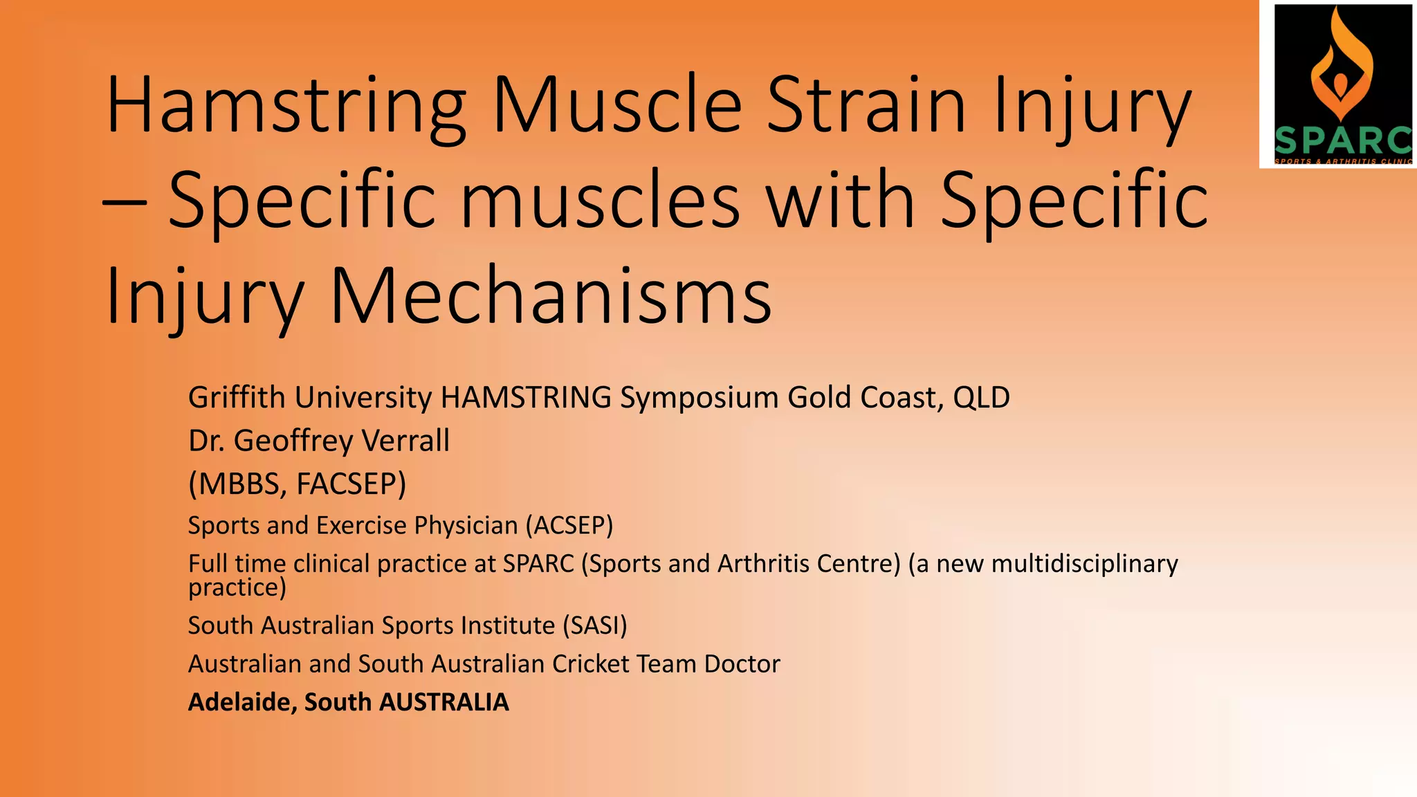 This document discusses hamstring muscle injuries, their mechanisms, and implications for rehabilitation and prevention. It begins by outlining the biomechanics of the gait cycle and how forces are applied during the stance phase of sprinting. Specifically, it notes that a hamstring strain requires the muscle to be lengthening with a tug of war between its attachment points. The most common injuries involve the proximal tendons of the biceps femoris muscle during non-stance hip flexion or knee extension. Prevention strategies aim to decrease forces on the hamstring during lengthening through proper sprint technique and training specificity. Rehabilitation focuses on early motion and addressing muscle imbalances through stretching.