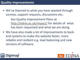 The document outlines updates and enhancements to Geo and Digimap services, including improved backend systems, new data collections, and interface changes for user experience. Key improvements include a new printable layout and legends, a new data client for geology, and future data integration efforts. Additional services and projects are mentioned, focusing on accessibility, user feedback, and long-term goals for better data utility and support.