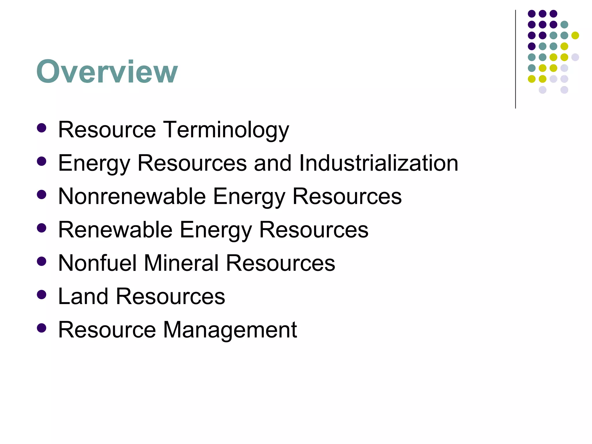 The document discusses various types of natural resources including energy resources like crude oil, coal, natural gas, and renewable resources like biomass fuels and hydropower. It also covers non-fuel mineral resources and land resources such as soils, wetlands, and forests. Resource management aims for sustainable development through conservation, reuse, and substitution to satisfy current needs without compromising the future.
