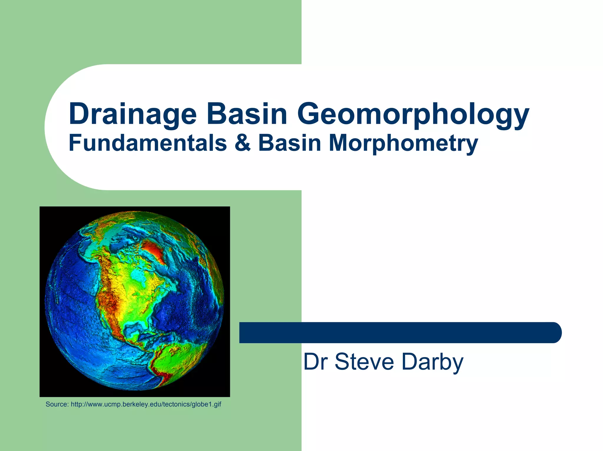 Drainage basin geomorphology can be summarized using morphometric analysis. Key variables include drainage patterns, stream order, basin shape, drainage density, relief, ruggedness, hypsometry, and topographic characteristics extracted from digital elevation models. Together these provide a quantitative description of basin form and allow comparison between basins. Basin form is influenced by climate, geology, and tectonics, and in turn influences hydrological and sediment transport processes within the basin. Morphometric analysis is needed to systematically describe basins and test hypotheses, but provides no direct insight into formative processes.