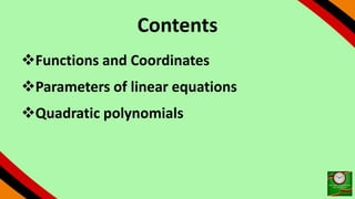 This document provides instructions for using GeoGebra to graph and explore functions and polynomials. It discusses how to create points, lines, and functions by entering their equations or using tools. It also describes how to create sliders to manipulate the parameters of linear and quadratic equations, and explores how changing the parameters affects the graphs. The document demonstrates finding roots, extrema, and drawing tangents for cubic polynomials with adjustable parameters.