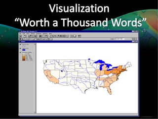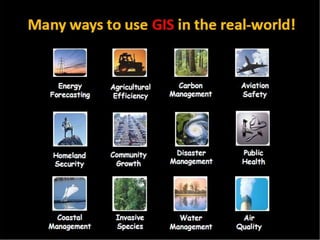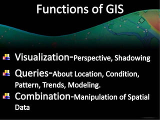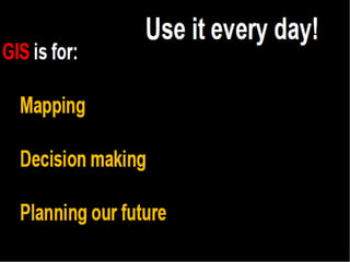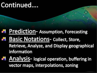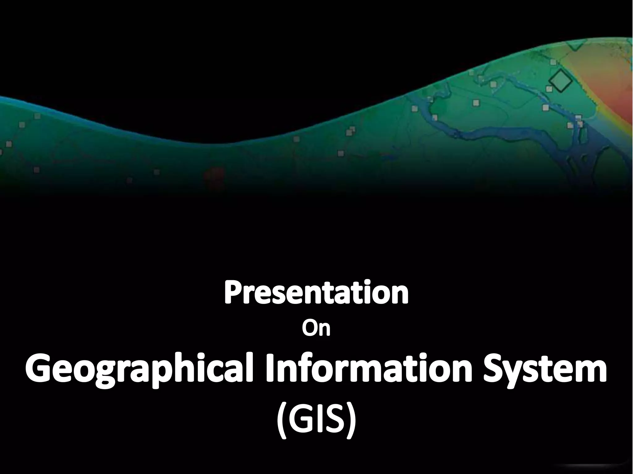 A GIS is a type of information system that uses geographical data to produce useful information for decision making. It is a computer system combining software, hardware, data, and personnel to manipulate, analyze, and present spatial data and information. A key part of a GIS is the person exploring the data to gain insights. The system captures data from various sources, organizes it, and allows the user to perform spatial analysis to create maps, models, and statistics.