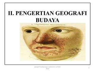 Dokumen tersebut membahas tentang pengertian geografi budaya. Geografi budaya mempelajari aspek material budaya manusia yang memberikan corak khas suatu wilayah, terutama pada landskap. Geografi budaya juga mempelajari perilaku, aktivitas, dan struktur masyarakat manusia dalam kaitannya dengan ruang dan lingkungan serta keanekaragaman budaya.