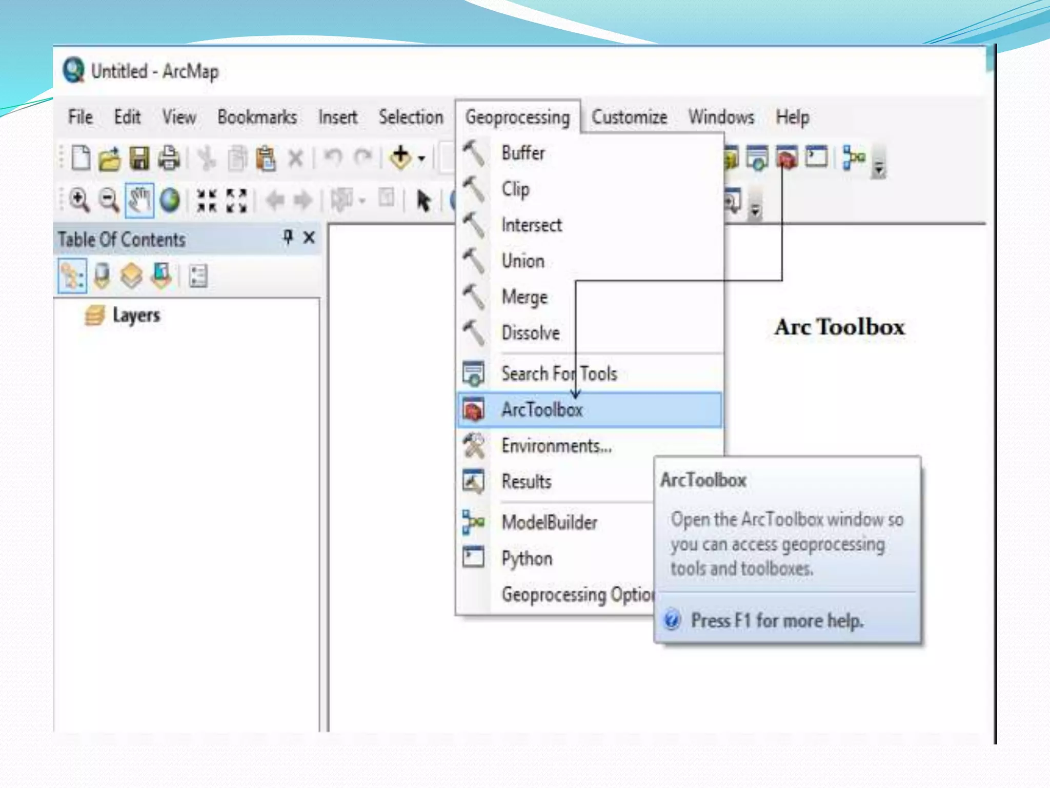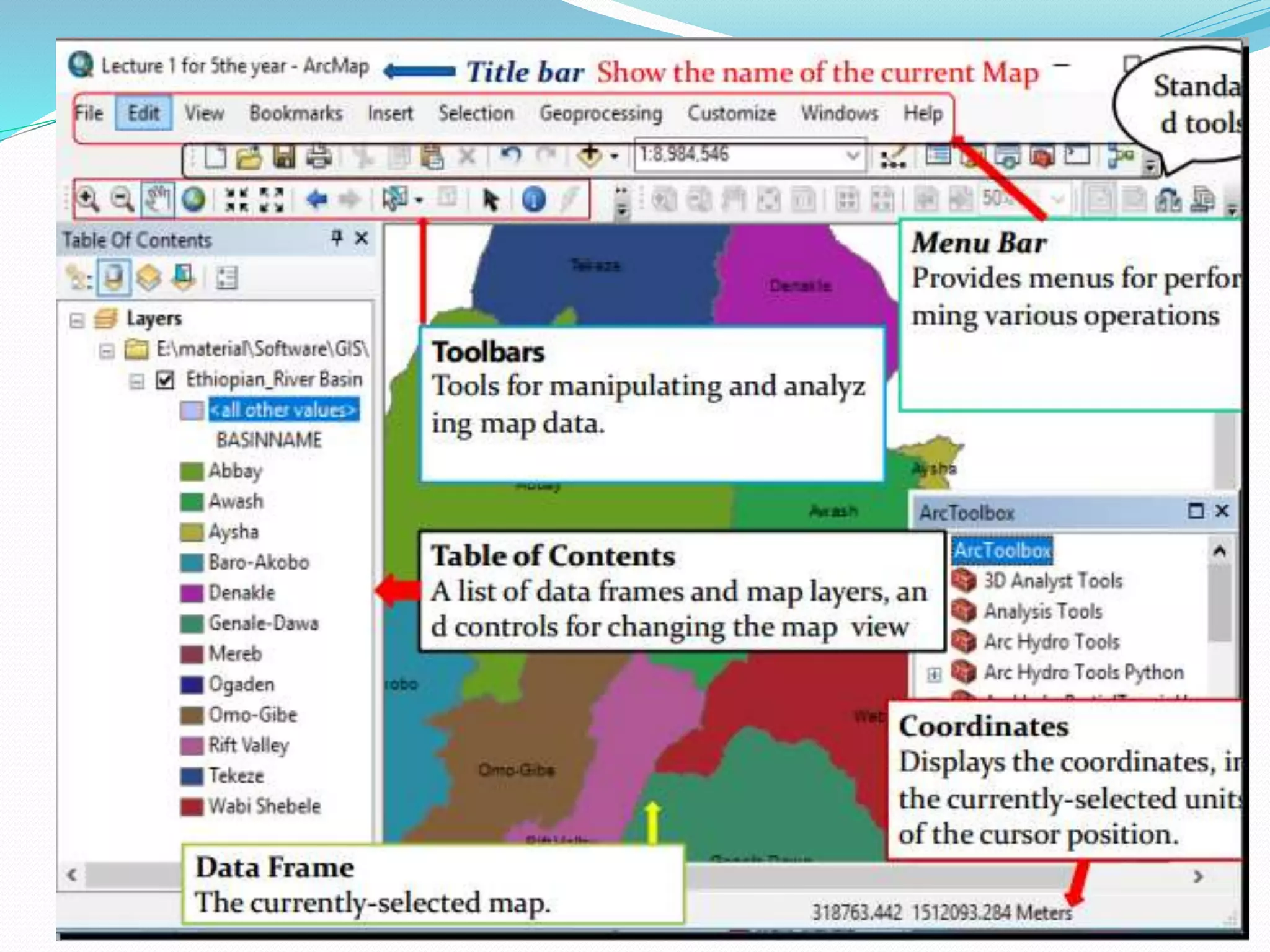 The document provides an overview of remote sensing and GIS tools used in mapping and spatial analysis, focusing on ArcGIS software functionalities such as ArcMap, ArcToolbox, and ArcCatalog. It covers essential operations including data integration, map layer editing, watershed delineation, and cartographic principles necessary for effective map-making. Furthermore, it includes links to tutorials and resources for further learning and practical applications in GIS.