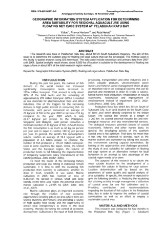 This document summarizes a study that used geographic information systems (GIS) to determine suitable areas for floating net cage aquaculture in Pelabuhan Ratu Bay, Indonesia. Spatial analysis of environmental and water quality parameters identified approximately 8,500 hectares, or 98% of the study area, as very suitable for net cage aquaculture. The analysis incorporated 12 biophysical variables and assigned scores to classify suitability. The results can help optimize sustainable aquaculture development and fishery production in the region.