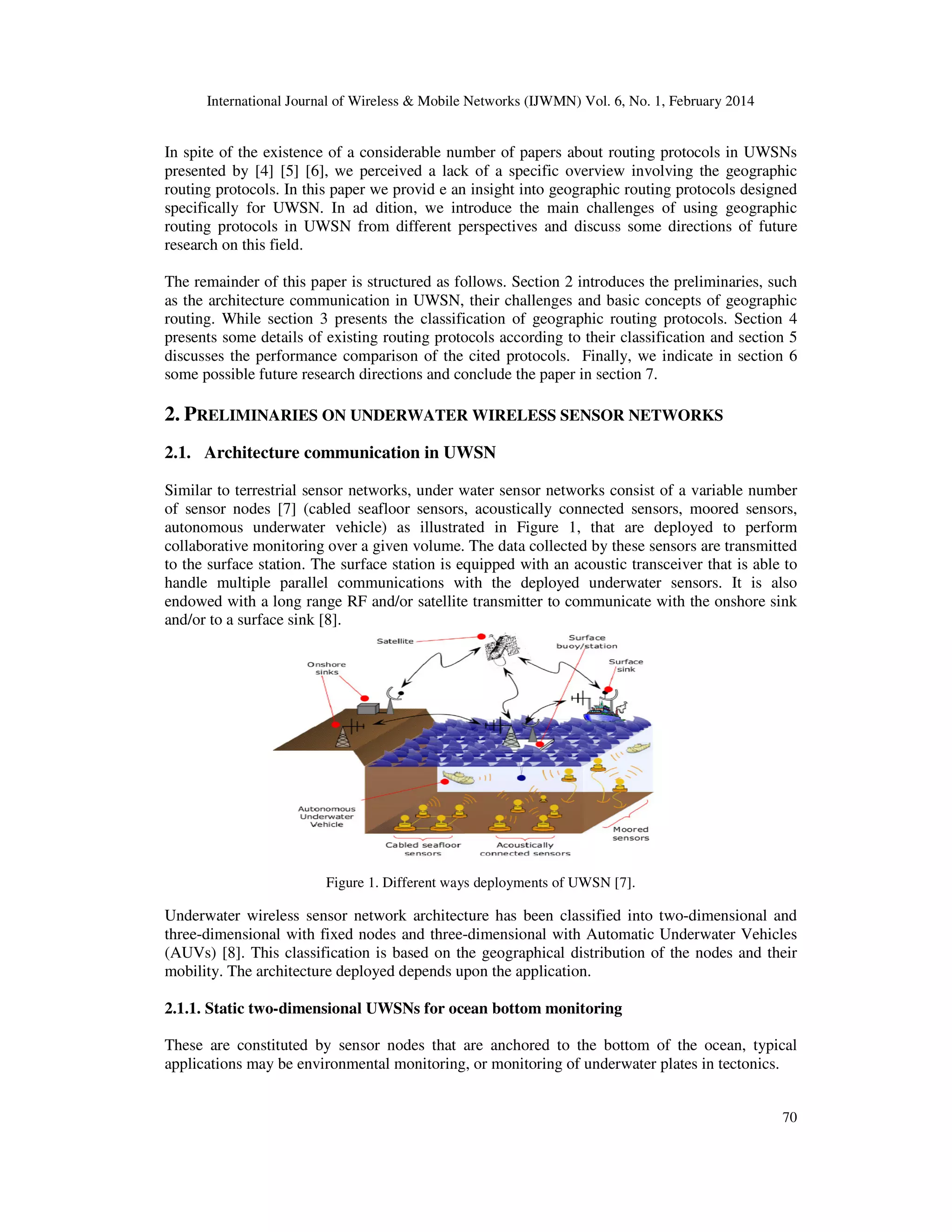 The document surveys geographic routing protocols for underwater wireless sensor networks (UWSNs), highlighting their unique challenges such as limited bandwidth and the effects of the aquatic environment. It classifies these protocols into three categories: greedy forwarding, restricted directional flooding, and hierarchical approaches, while also reviewing their performance and implementation specifics. The paper aims to provide insights into existing protocols and discuss future research directions in this field.