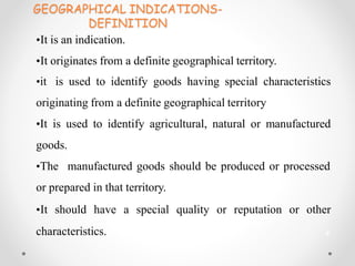 This document discusses geographical indications (GIs), including their definition, benefits, examples, registration process, challenges, and relationship to trademarks. Some key points: