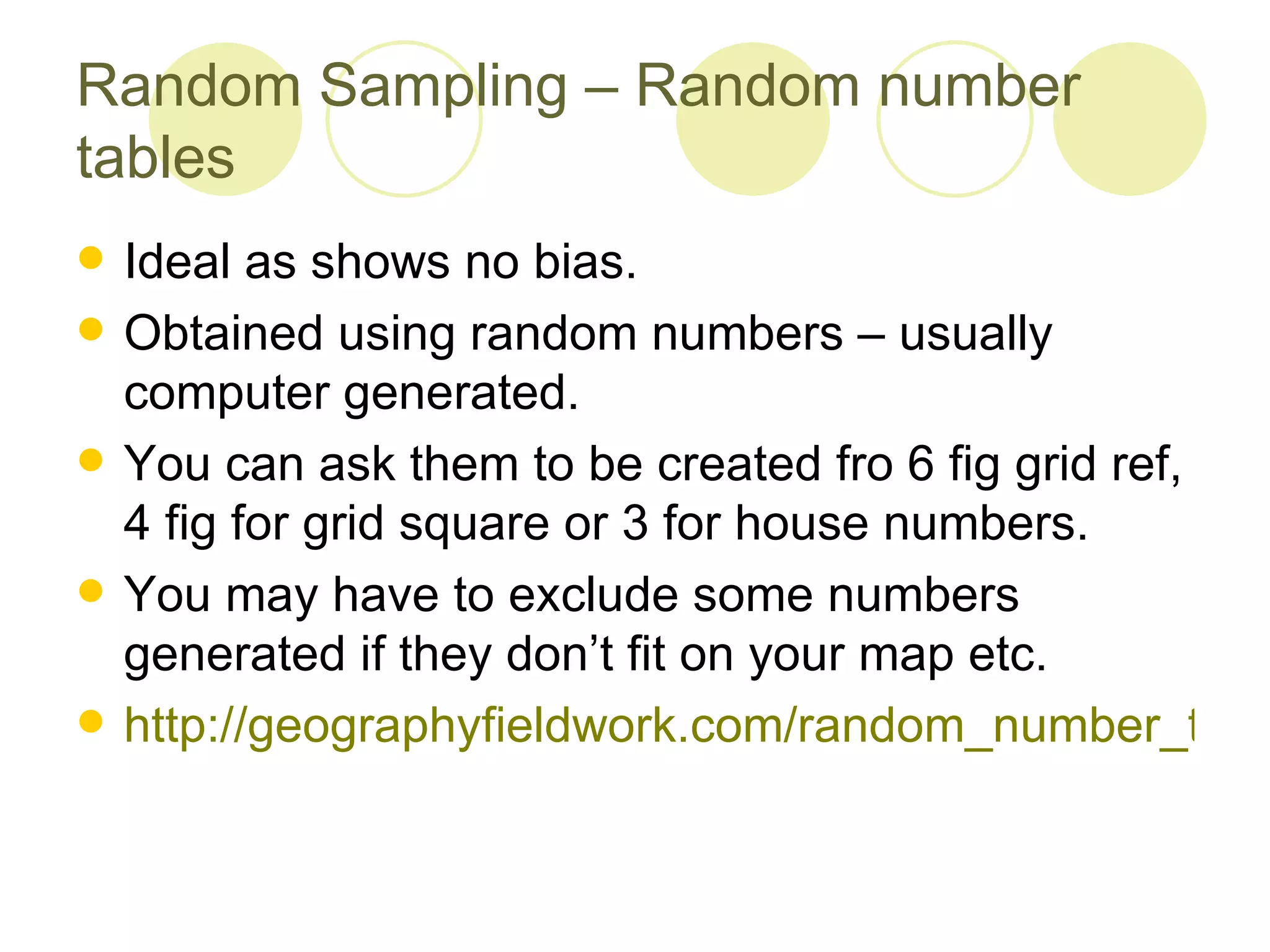 1. Random sampling techniques like random number tables that avoid bias when selecting sample locations.