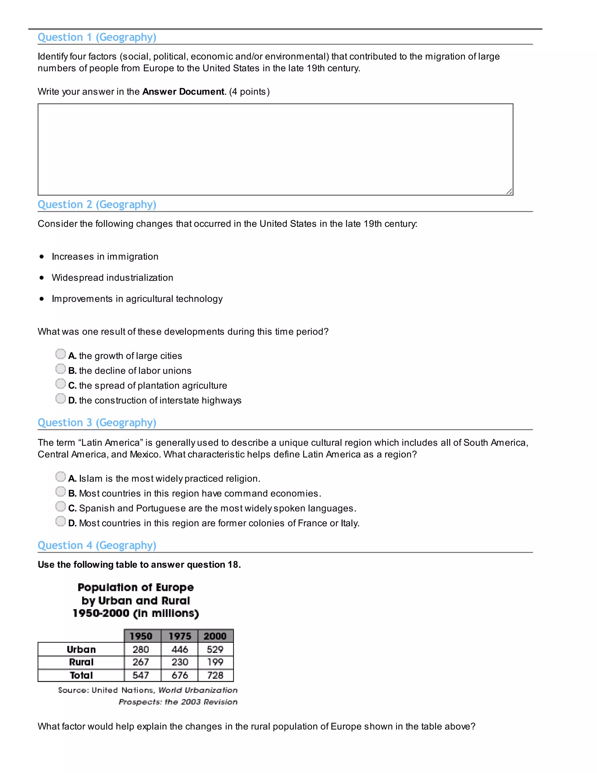 This document contains 13 multiple choice questions about geography topics such as migration patterns, reasons for immigration to the United States in the late 19th century, factors that led to urbanization in the US, and the establishment of economic regions through agreements like NAFTA. The questions are part of a test and assess understanding of geographic, economic, and demographic changes over time periods like the late 19th century and post-World War II era.